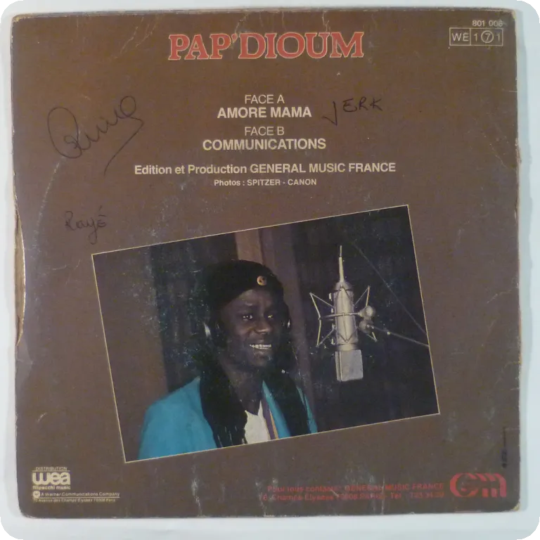 Boogie disco winner on this single record in Paris by West African artist, likely from Senegal. Sleeve has some dirt & aging, writings & rubber stamp, writings & dirt on labels. Constant reasonable to