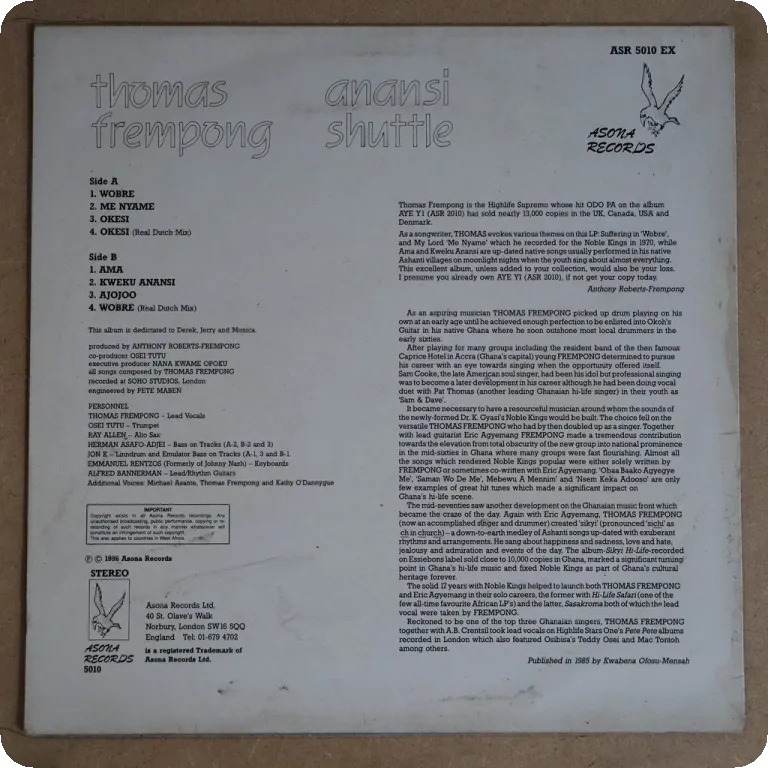 Features the spacey disco funky highlife tune "Yesu san bra" w/ fender rhodes piano solo, the uptempo boogie highlife "yamona" & 2 solid roots reggaes. White label test press. Cover has peeling of the