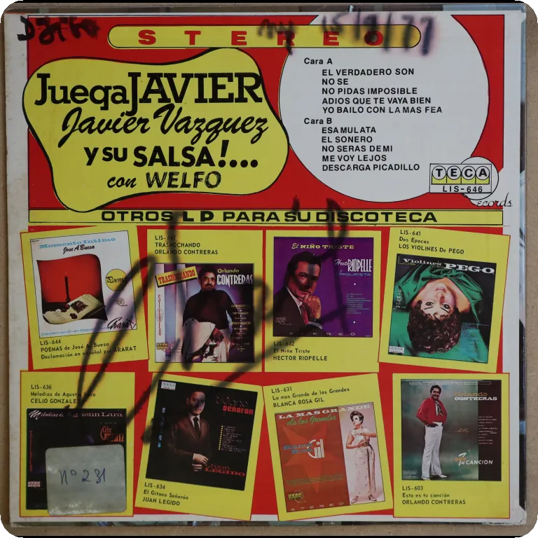 Nice early salsa LP arranged by Javier Vasquez. Minor wear on cover, bite on back, peel off on front, dirt & ringwear on back, plays with light to hardly noticeable noise despite numerous marks. .