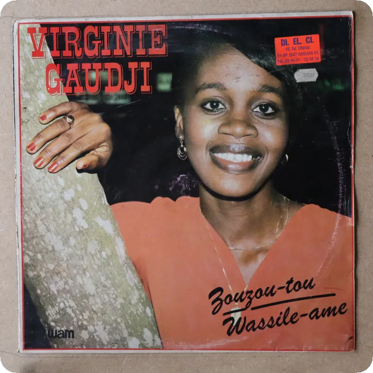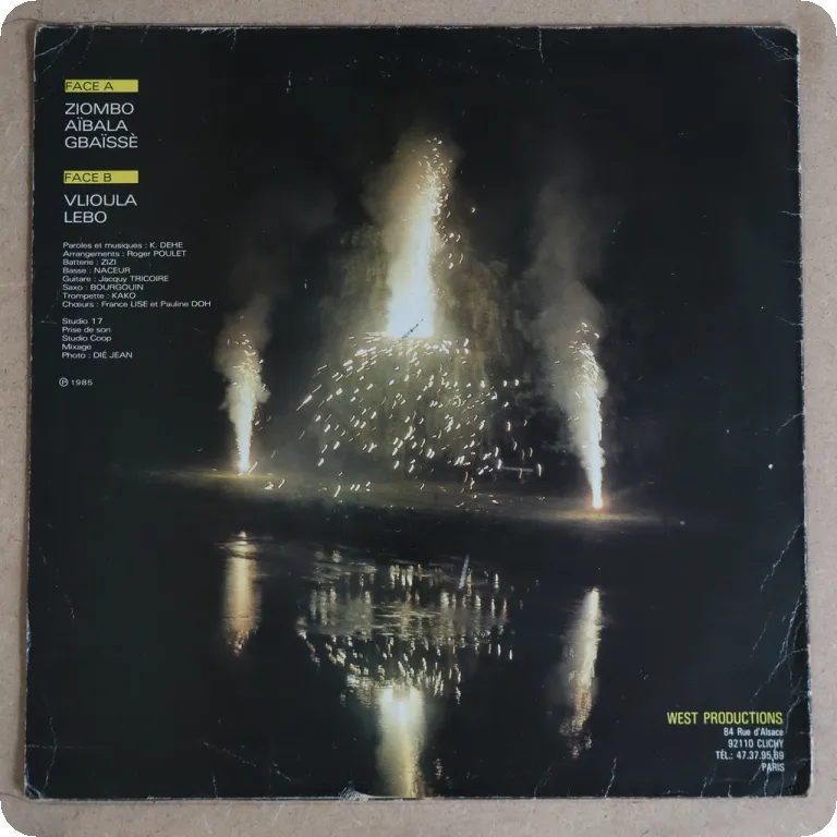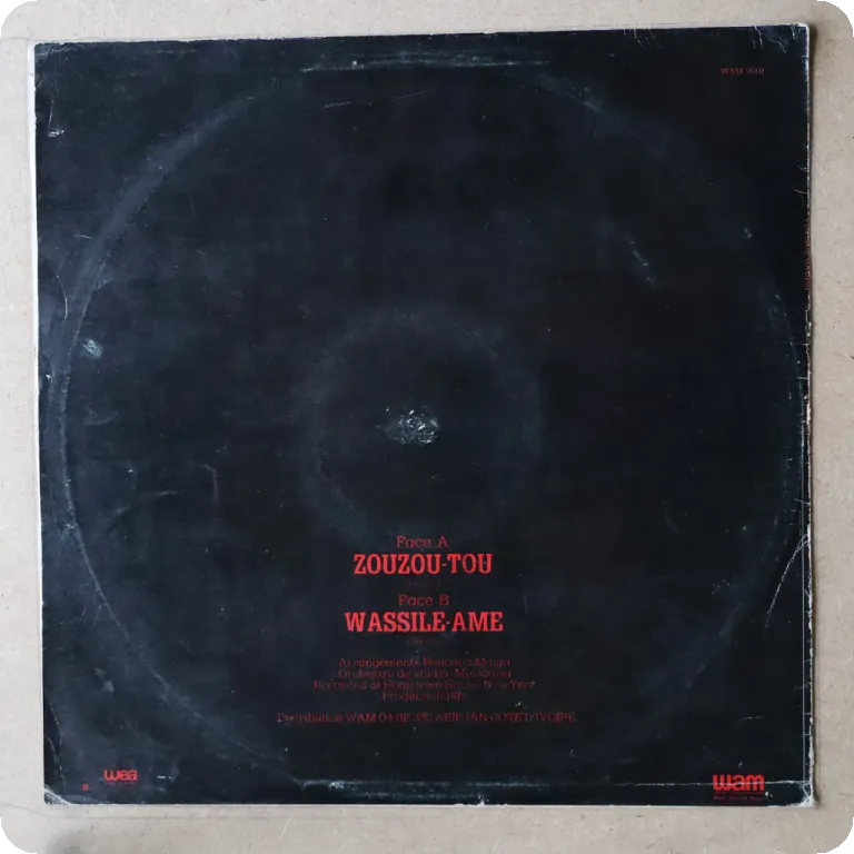 Soukous & afro pop synth out of Ivory Coast. Large writings on cover & labels, light brown water damage wear on top spine corner, plays with light to hardly noticeable noise, solid VG- to VG/VG+