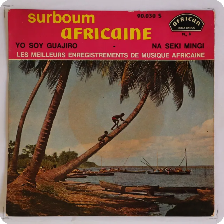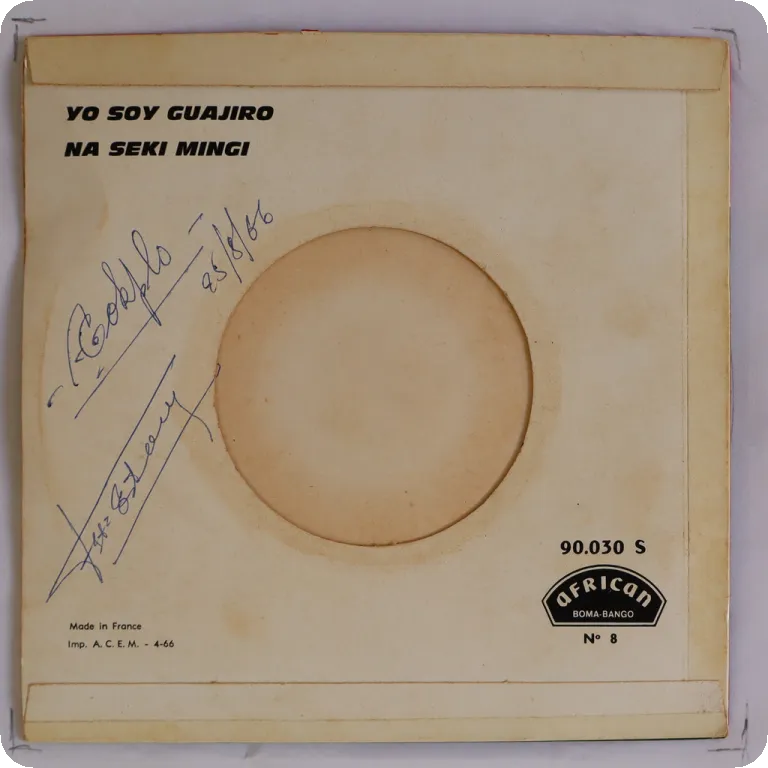 A guajira cha cha cha & a rumba on this mega scarce Congolese release, dirt wear on cover, writings on back & A label, record has very reasonable to light noise from marks.
