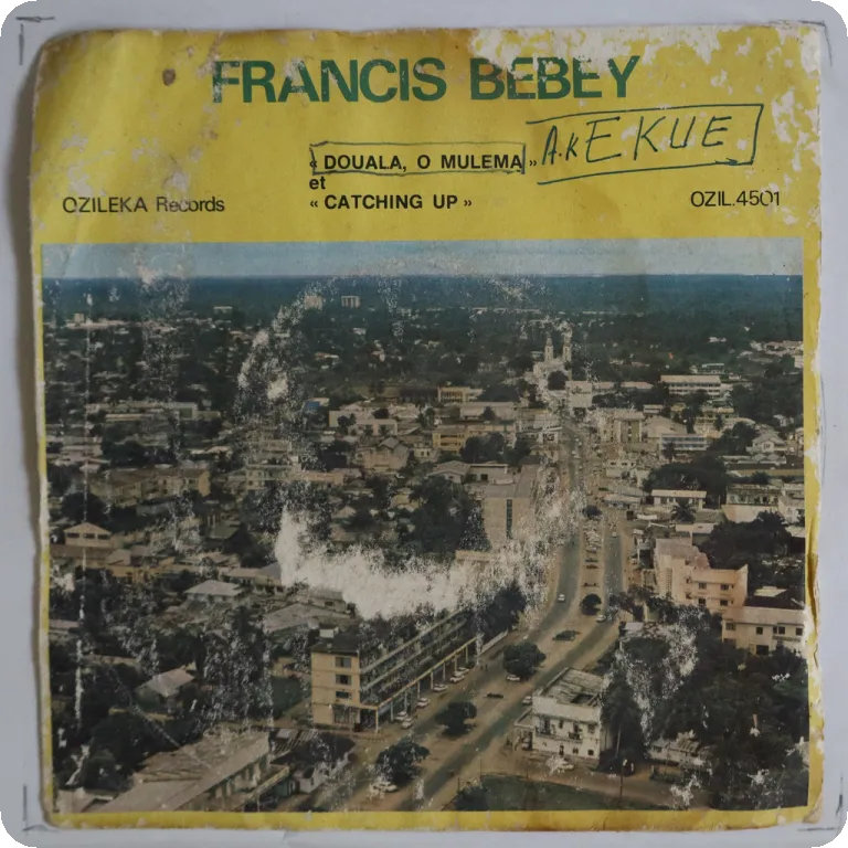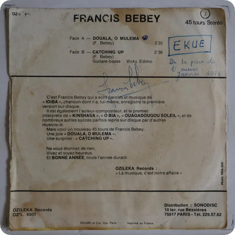 Killer spaced out minimal synth single only winner w/ spoken word as recorded by the south after Cameroon genius. Signed by Francis Bebey on back ! Aging, dirt, light brown water damage wear, peel off