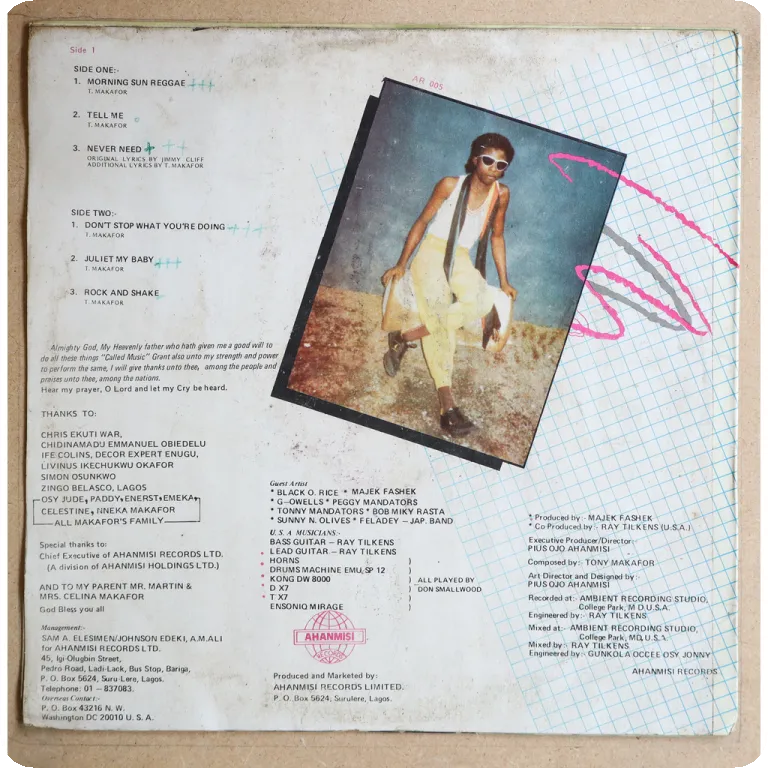 Check the electro funk & the electro oldies rap tunes on this Nigerian release produced by Majek Fashek. Dirt & writings on back, record plays very nicely on stanout tunes, minor occasional noise only