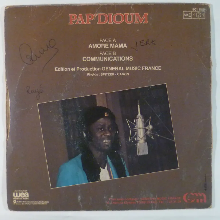 Boogie disco winner on this single record in Paris by West African artist, likely from Senegal. Sleeve has some dirt & aging, writings & rubber stamp, writings & dirt on labels. Constant reasonable to light noise from numerous marks.