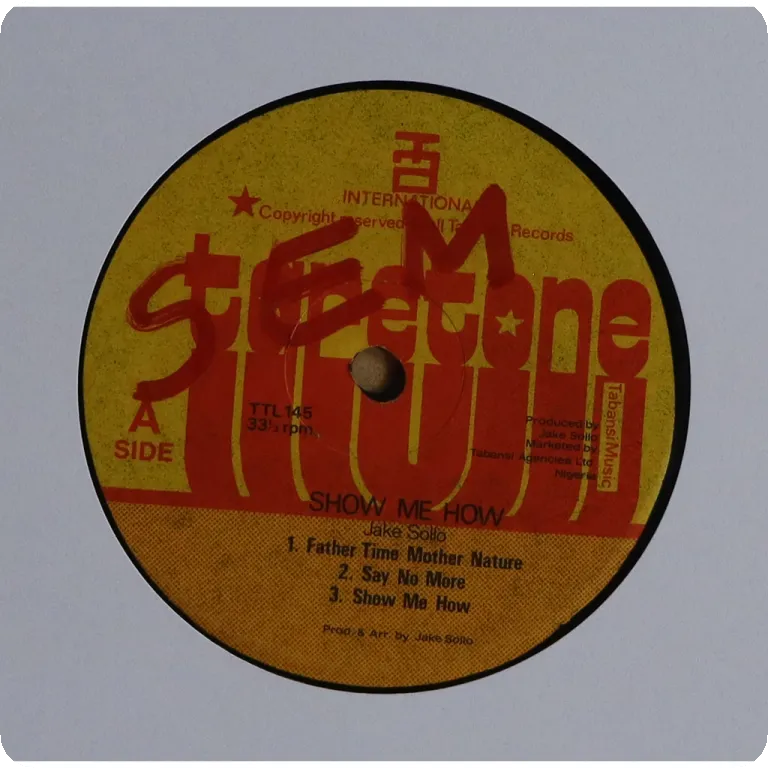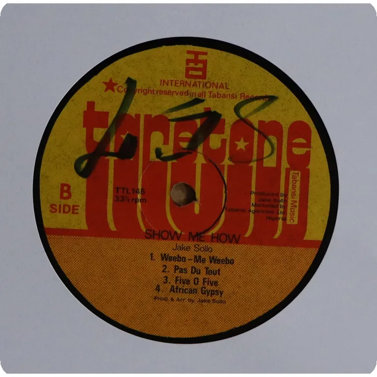 Consistent boogie disco & modern soul LP released by former bandmember of the Nigerian afro funk group the Funkees. Sleeve is missing, large writings on labels, record plays w/ light to hardly