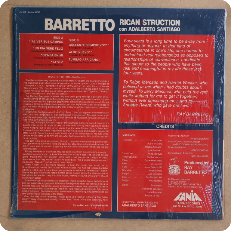 Solid dancefloor salsa winners & a nice boogaloo on this later LP by the Venezuelan artist. Sleeve in OG shrink w/ some wear and dirt, bump & mini tears on mouth, sticker on front, writings on labels