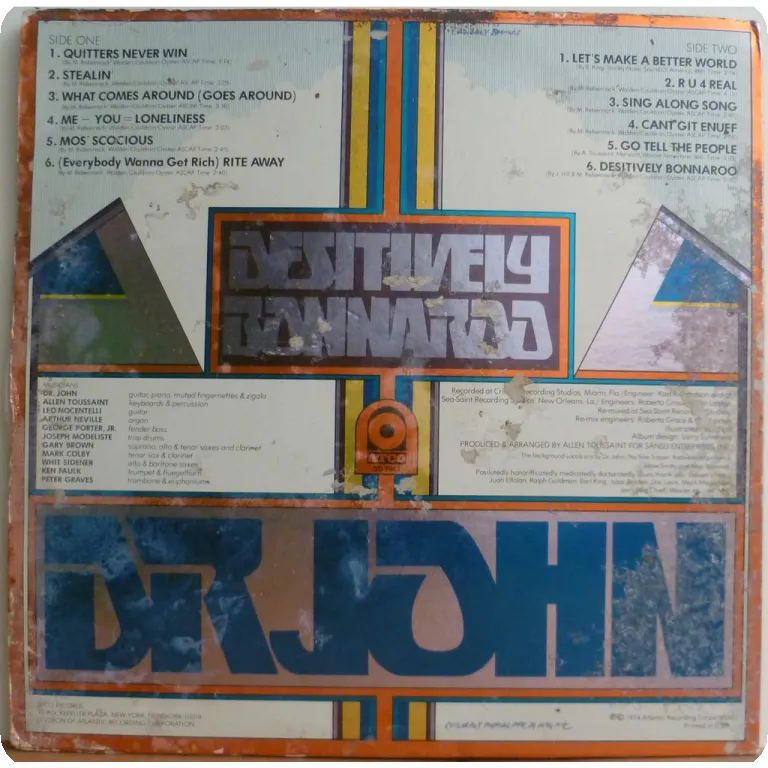 Lousiana bayou funk on top as recorded by the iconic artist with legendary Meters, strong wear on cover, dirt, & moisture & peel off, record has occasional noise from dirt but is in very nice shape.