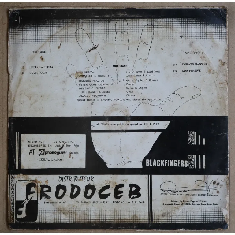 Hypnotic minimal afro synth winner & soukous on this scarce release from Benin featuring Niger musicians. Sleeve has aging & dirt, narrow bites along mouth & spine, light brown water damage, writings