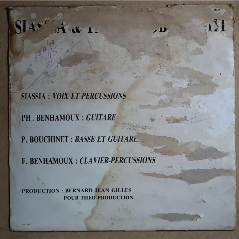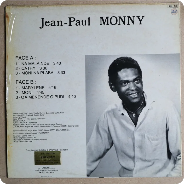 Jaw dropping minimal synth disco / new wave & tropical disco soukous hybrid on this super obscure and indemand 3 tracker French meets African musicians LP. Never shows up !Sleeve w/ large peel off & light brown water damage, bite on top, writings on back & B label, light brown water damage wear on labels, light aging & dirt & peel off along bottom, mini bite on one of the bottom corners, record plays VG to V++, has light clicks from marks on second part of A1 tune and A2 but very enjoyable.