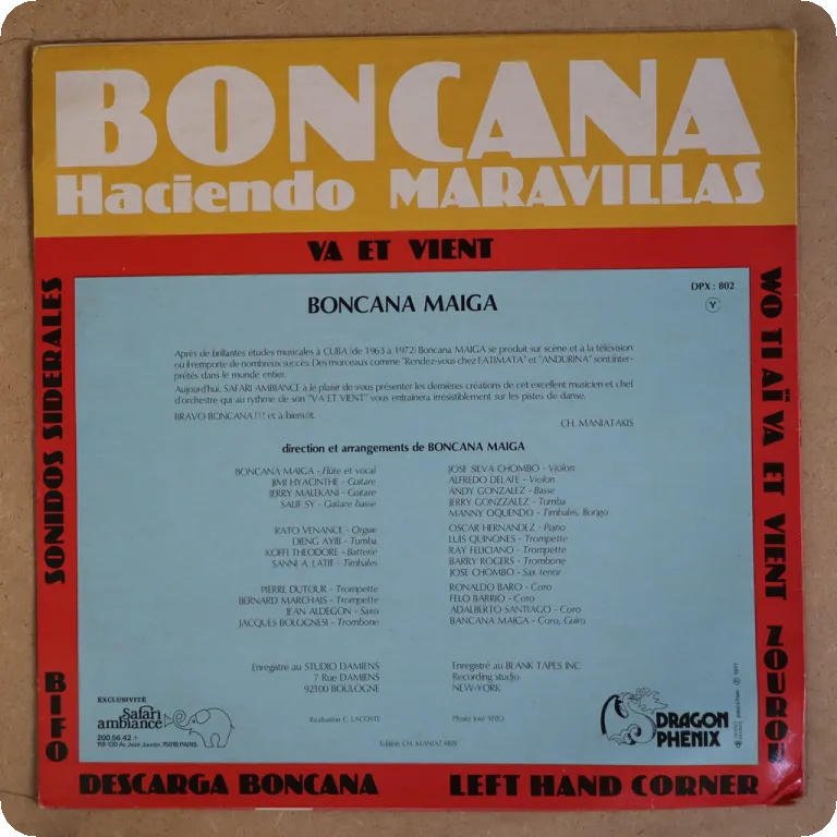 An afro latin montuno w/ charanga violins "Descarga Boncana" and the afro disco "Zourou" & "left hand corner", light aging & dirt wear, creas on bottom spine minor occasional noise only.