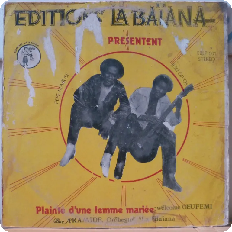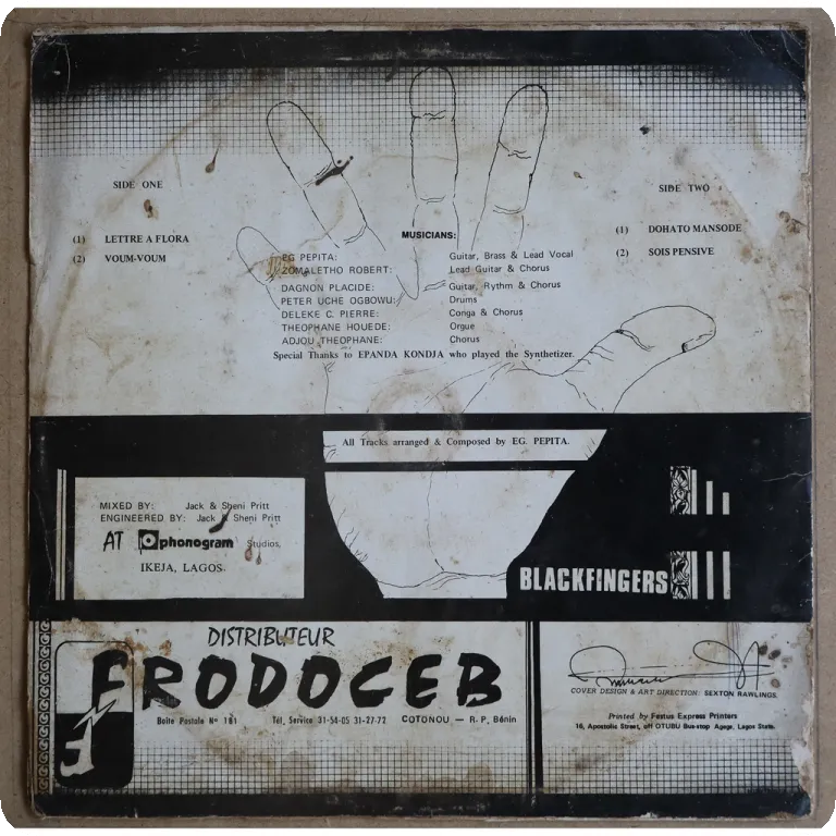 Hypnotic minimal afro synth winner & soukous on this scarce release from Benin featuring Niger musicians. Sleeve has aging & dirt, narrow bites along mouth & spine, light brown water damage, writings on front & labels, record plays w/ pressing hiss/dull sound on B1 (clip 2) otherwise it is in pretty nice shape w/ only a few marks.