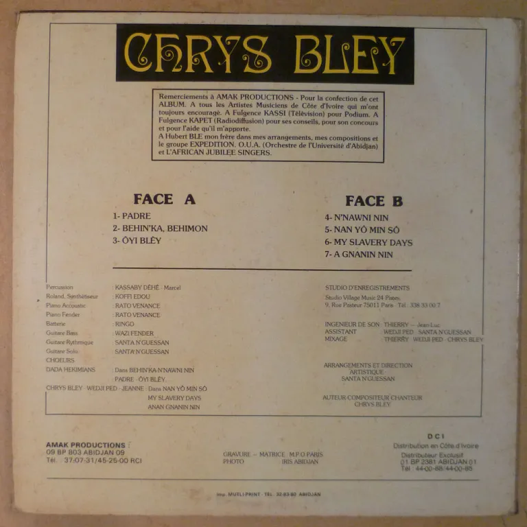 Hypnotic Afro synth / new wave disco & afro synth pop two trackers on this scarce Ivory Coast release w/ backing by the country's creme de la creme : Rato Venance on synth, Kassaby Dehe on percussions, Santa N'guessan on guitars, Wedji Ped on vocal chorus. Sleeve has light aging & dirt, some noise from light marks, plays VG- to solid VG.