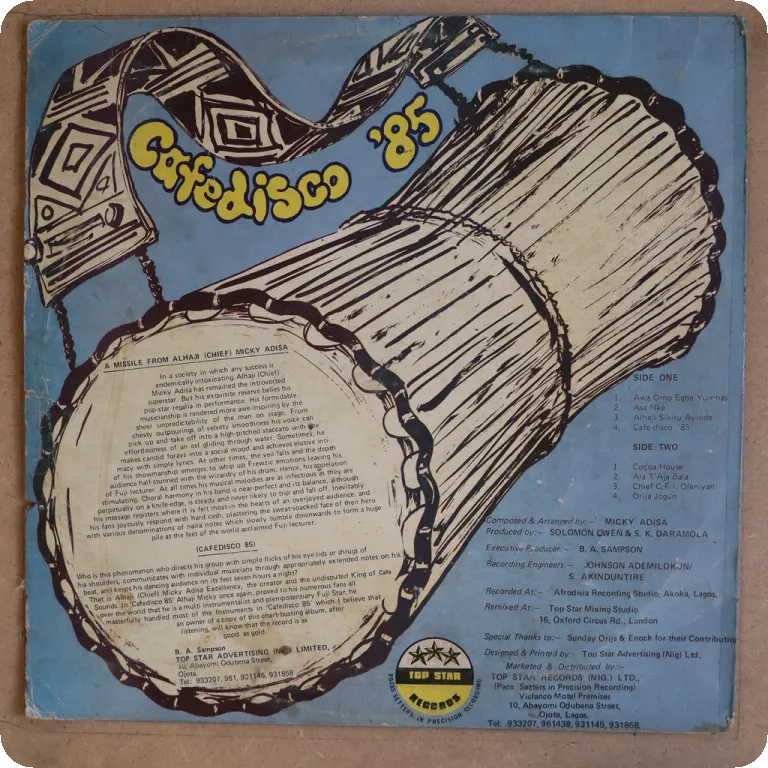 Deep Nigerian fuji music rarity. Sleeve has wear & aging, strong dirt on back, 0,5" tear & creas on mouth on front, record plays nicely w/ only minor occasional noise despite marks.